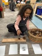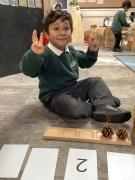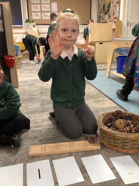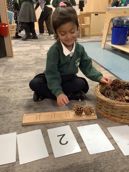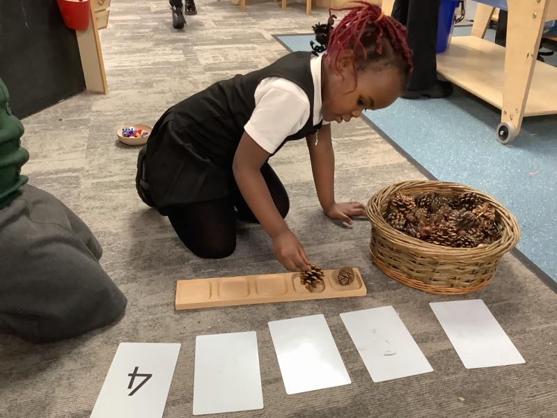 The Reception children explored number bonds to 5. They turned over a numeral card and counted out that many natural objects onto a 5s frame. They then worked out how many more they needed to make 5 and represented the number bond on their fingers.