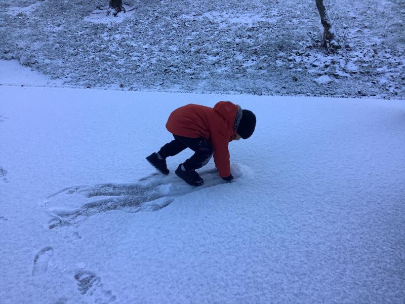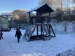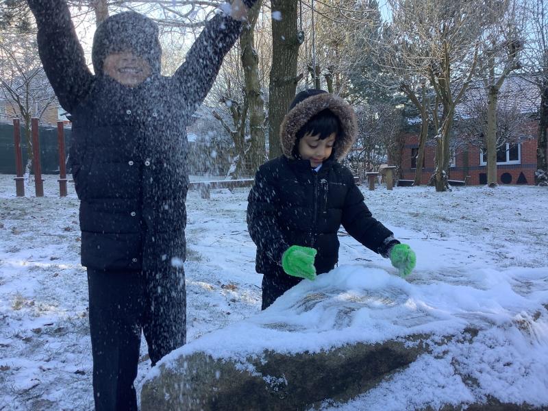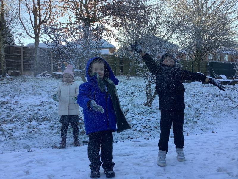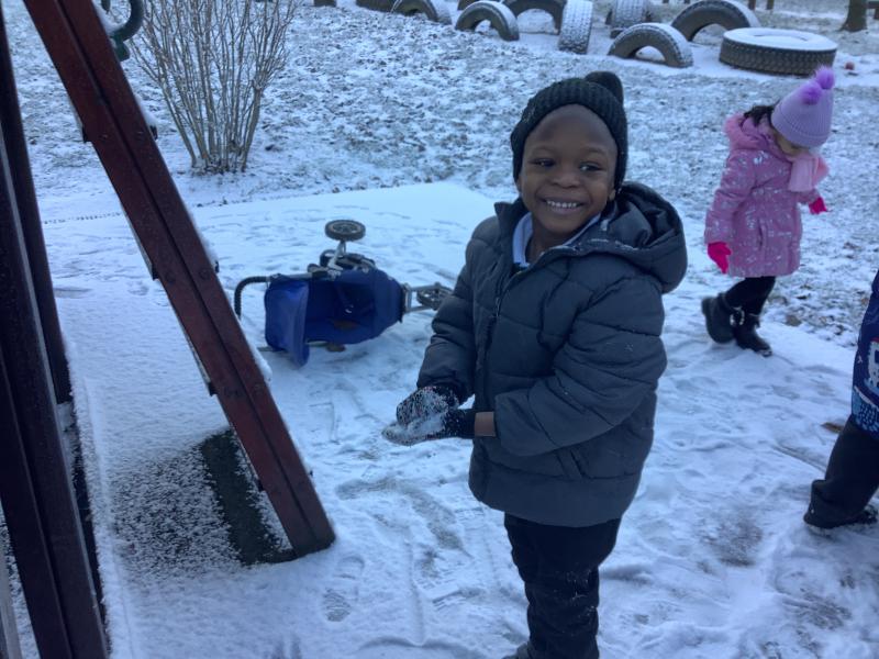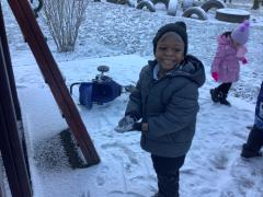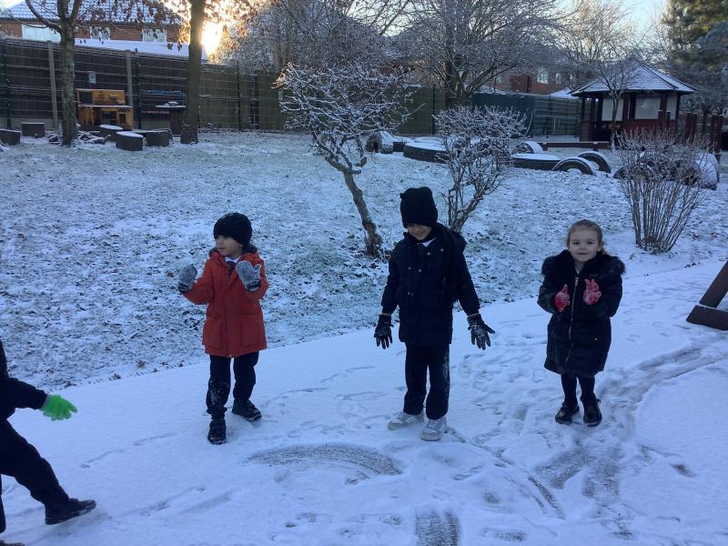 The children enjoyed playing in the snow outdoors and showed lots of interest in what they could do with it. They used their hands to pick up the snow and noticed that it melted as they held it. They used a shovel to scoop, lift and move the snow, showing confidence in their physical play. Whilst playing in the snow, we spoke about the season of winter and how cold weather affects the natural environment.