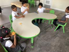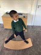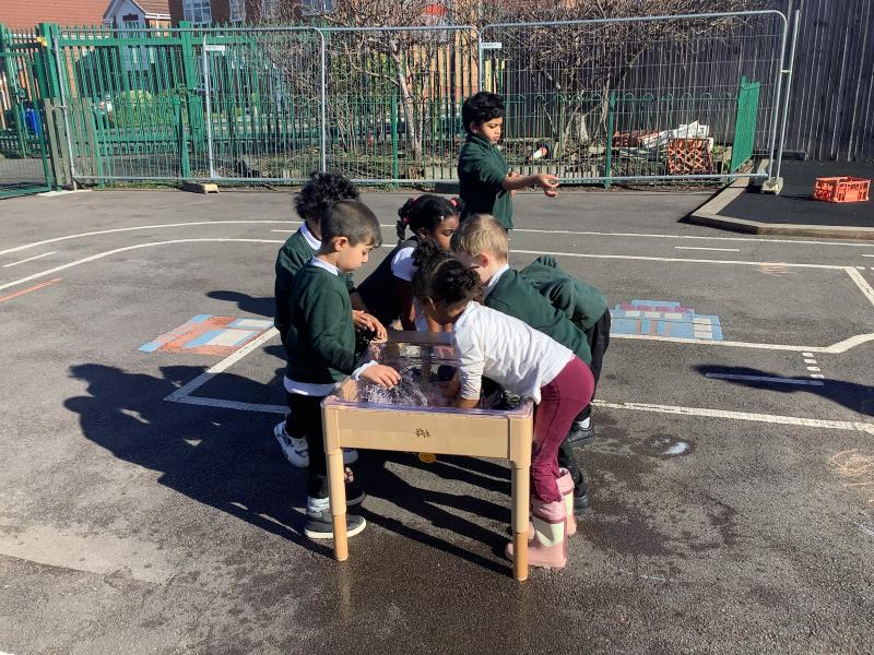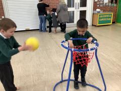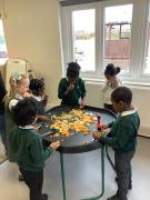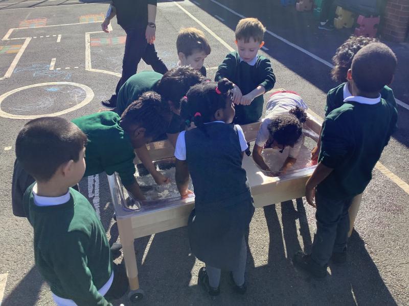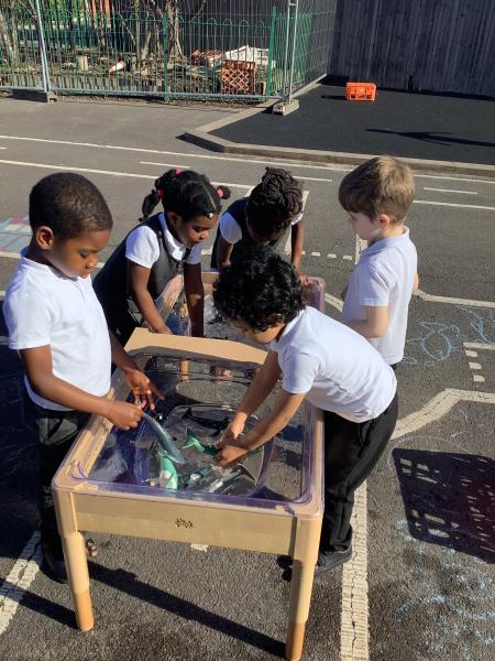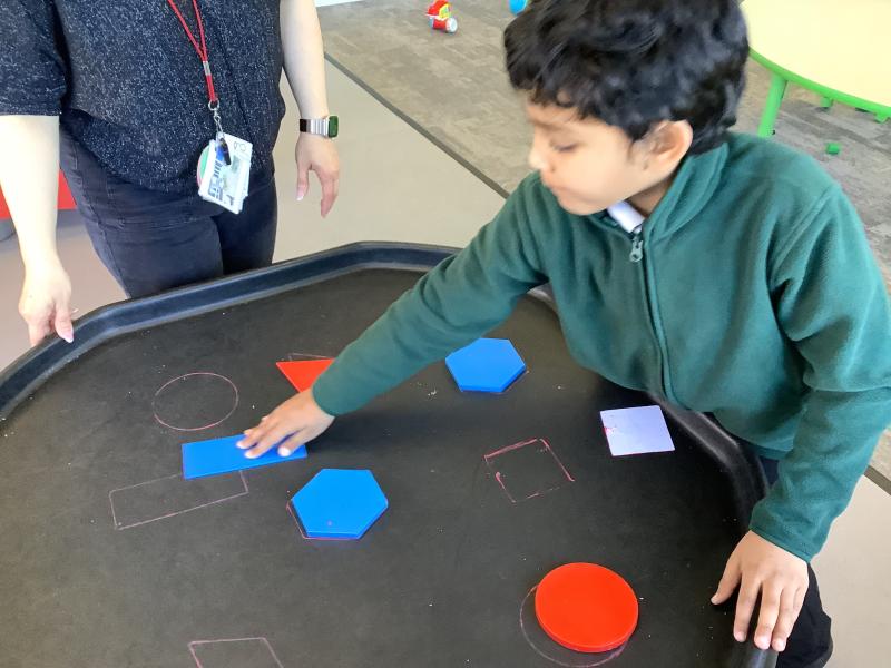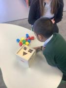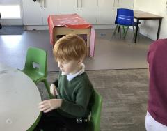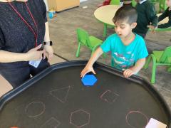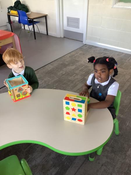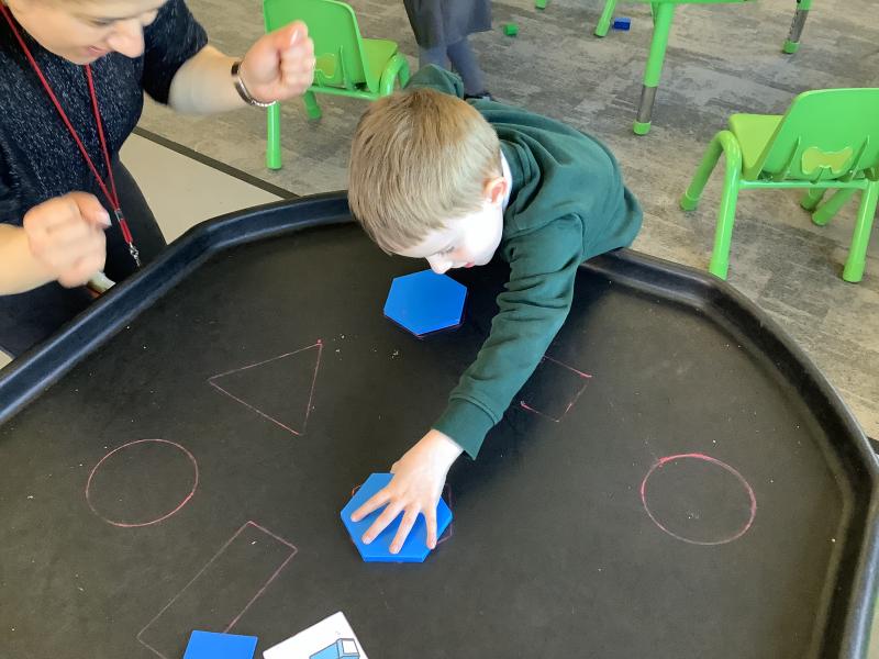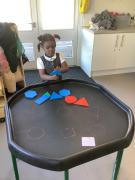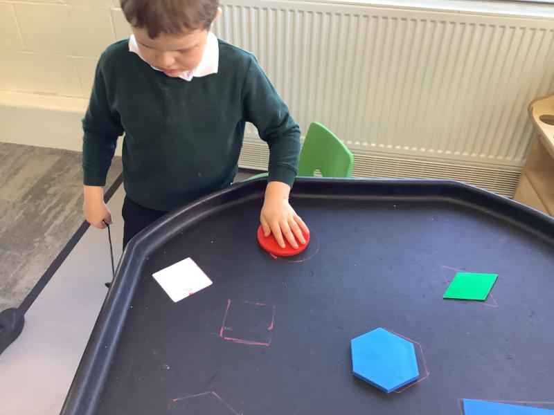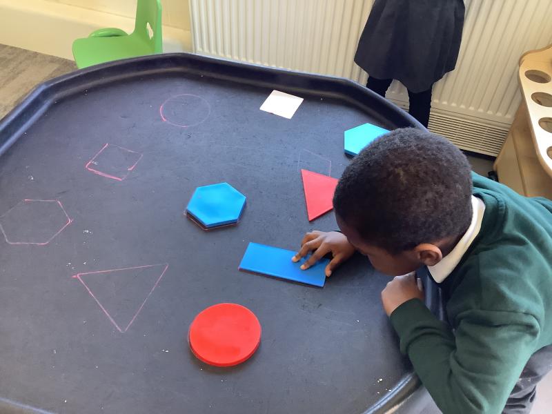 In maths we have been looking at shapes. The children have explored different shapes by matching them in the tuff tray and using a shape sorter.