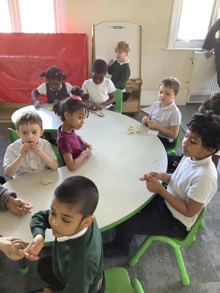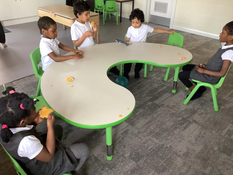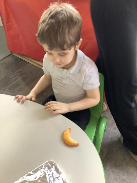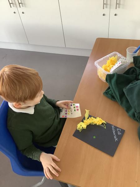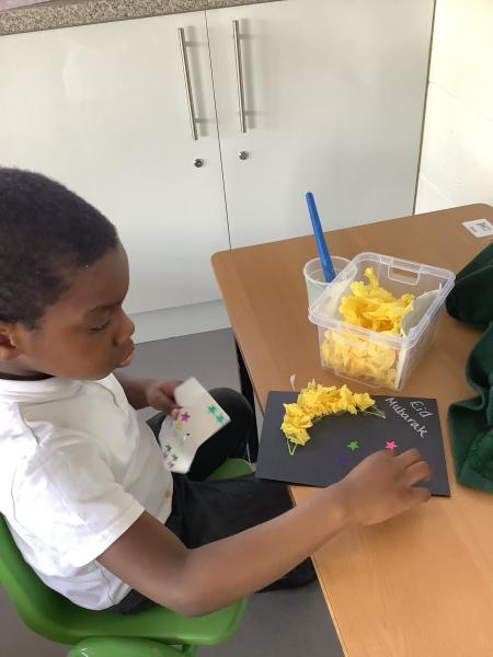 In our afternoon sessions this week we have been focusing on Eid. The children created cards by decorating the moon with a choice of tissue paper or glitter. Then on Wednesday we baked and decorated biscuits in the shape of either a moon or star, these were delicious!