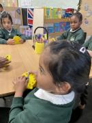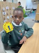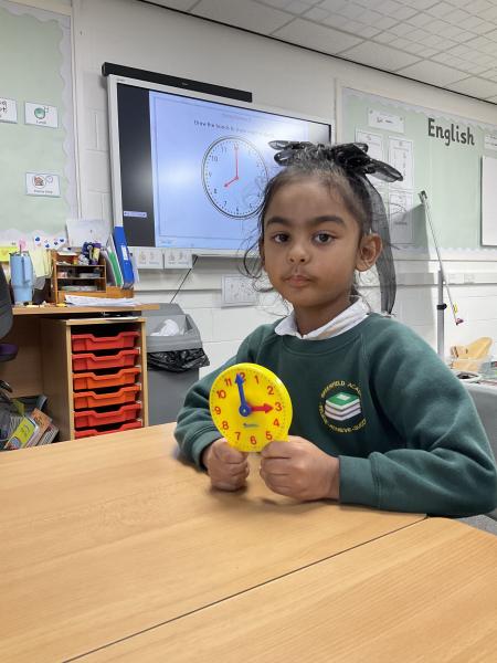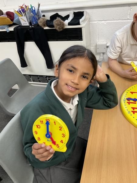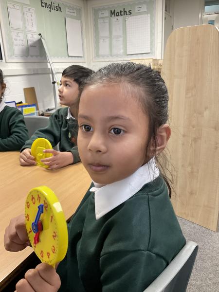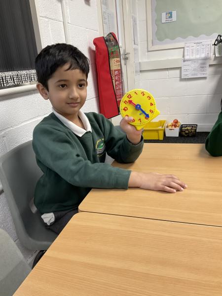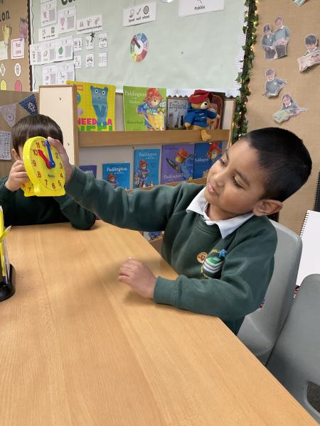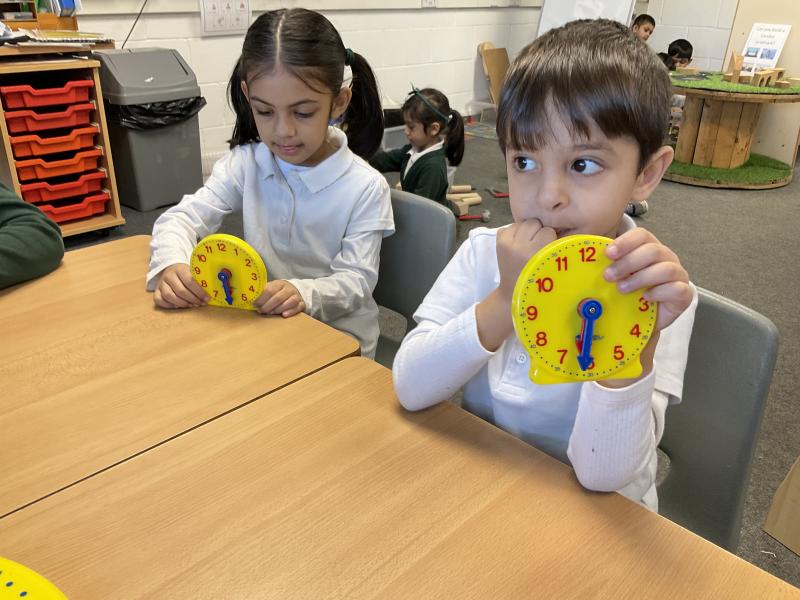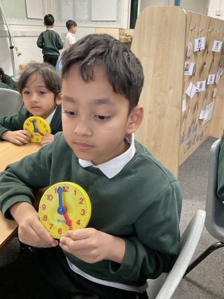 In Maths we have been learning to tell the time. We have been using the clocks to tell the time to half past and the time on the hour. We matched the times on our clocks to the time on a time card and then said the time. We all now know when it is dinner time!
