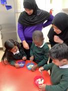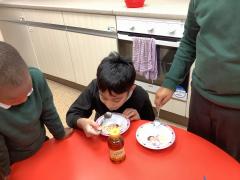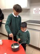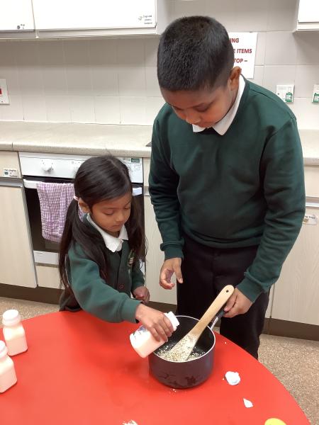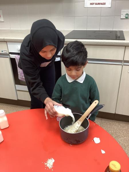 Today we buddied up with Year Six children to make porridge linked to our focus story ‘Goldilocks’. The children followed the rules on how to stay safe in the kitchen and followed the instructions on how to make porridge. We added honey to make it sweet and the children all enjoyed tasting it. Yum!